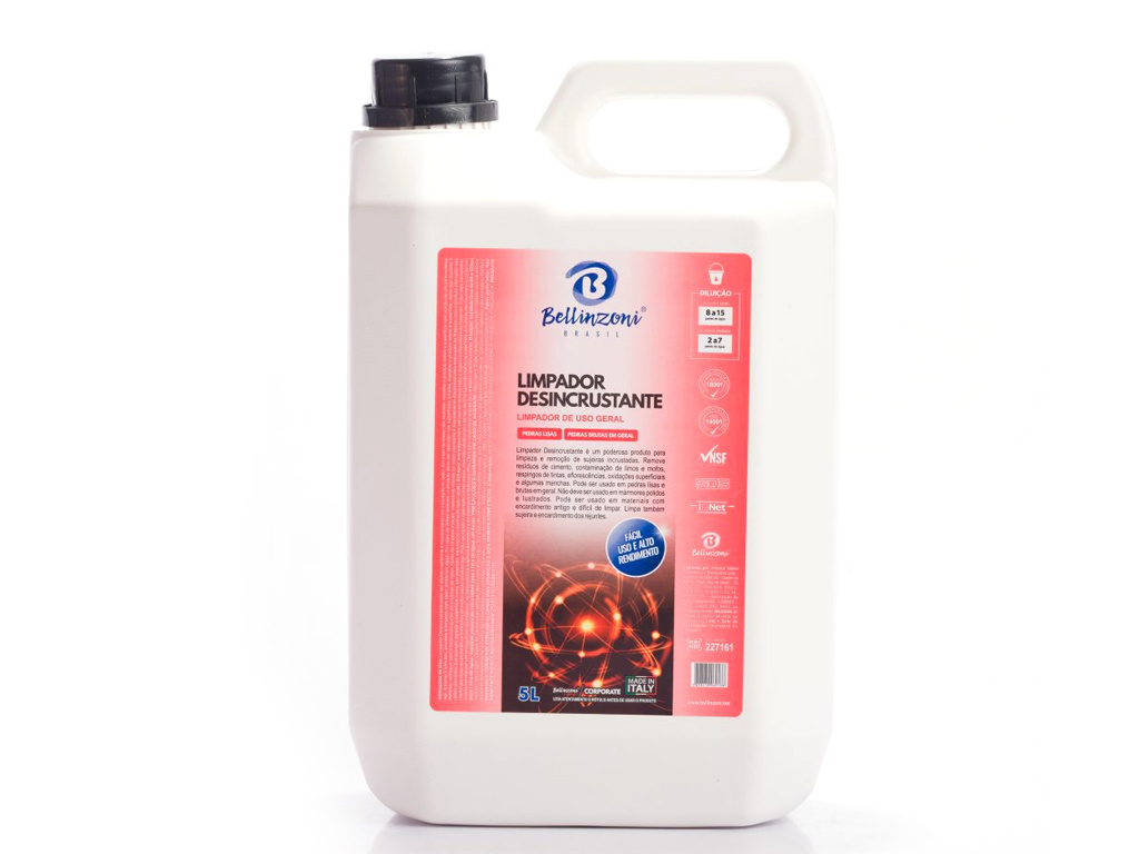 O Limpador Desincrustante da Bellinzoni é um poderoso produto para limpeza e remoção de sujeiras incrustadas. Remove resíduos de cimento, contaminação de limos e mofos, respingos de tintas, eflorescências, oxidações superficiais e algumas manchas. Pode ser usado em pedras lisas e brutas em geral. Não deve ser usado em mármores polidos e lustrados. Pode ser usado em materiais com encardimento antigo e difícil de limpar. Limpa também sujeira e encardimento dos rejuntes.