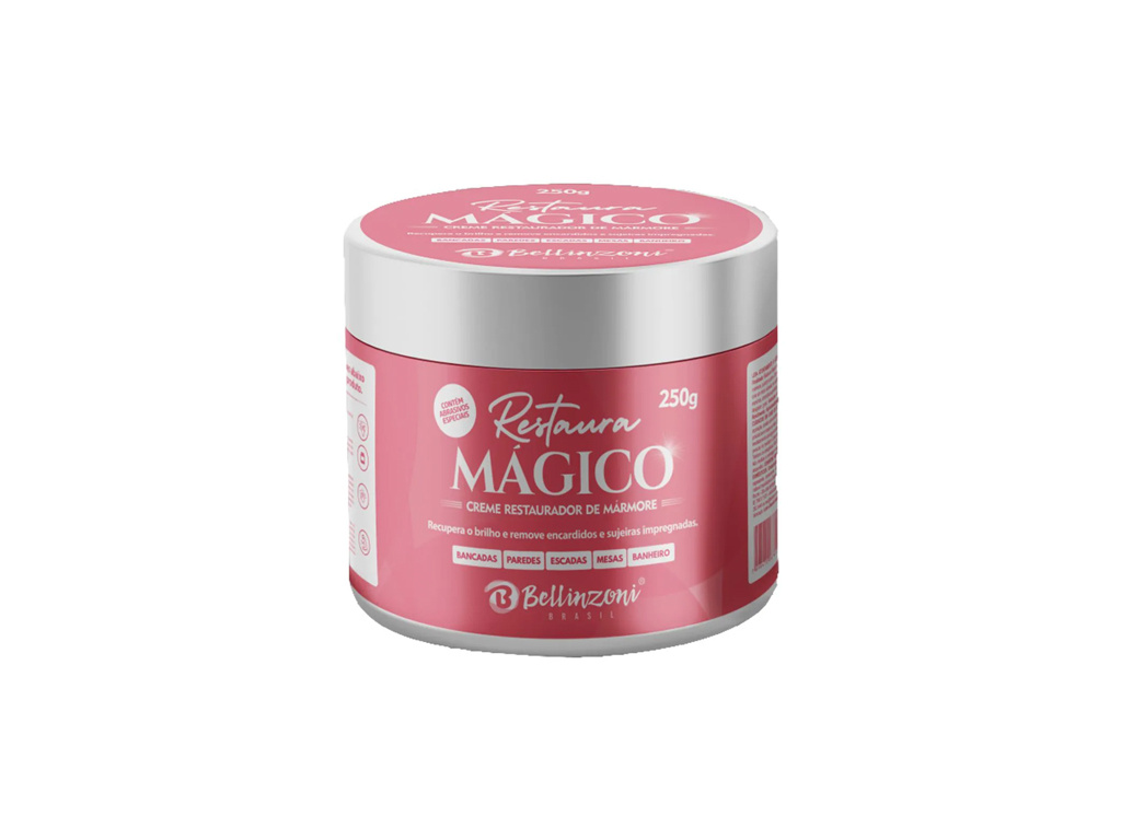 Restaura Mágico da Bellinzoni é um creme específico para polimento que remove arranhões e manchas de superfícies de mármore como bancadas, escadas e pisos.